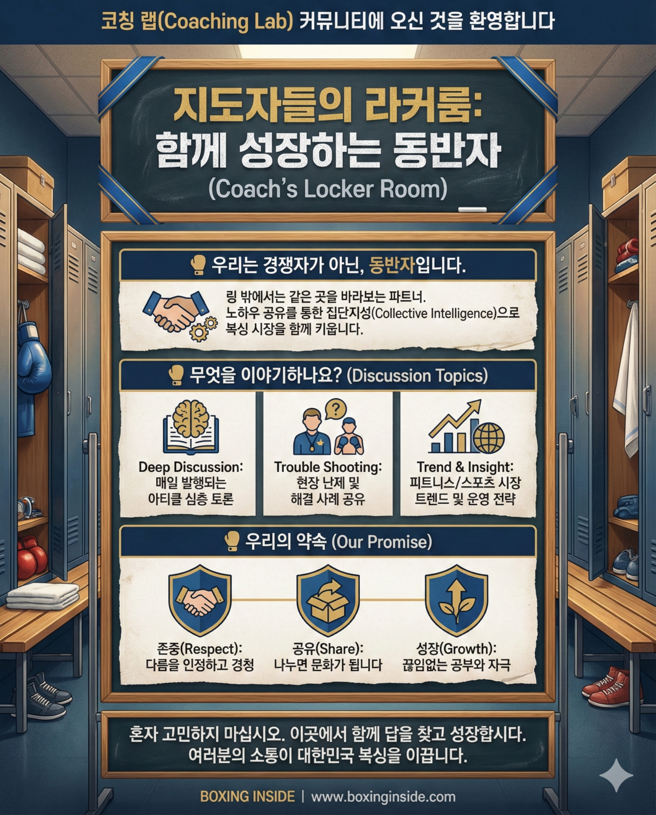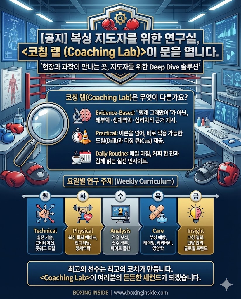 "오늘은 무엇을 가르칠까?" 실전 훈련 드릴, S&C, 전술 분석 등 현장에 즉시 적용 가능한 전문 칼럼을 제공합니다. 복싱에 관심 있는 누구나 자유롭게 열람할 수 있습니다.